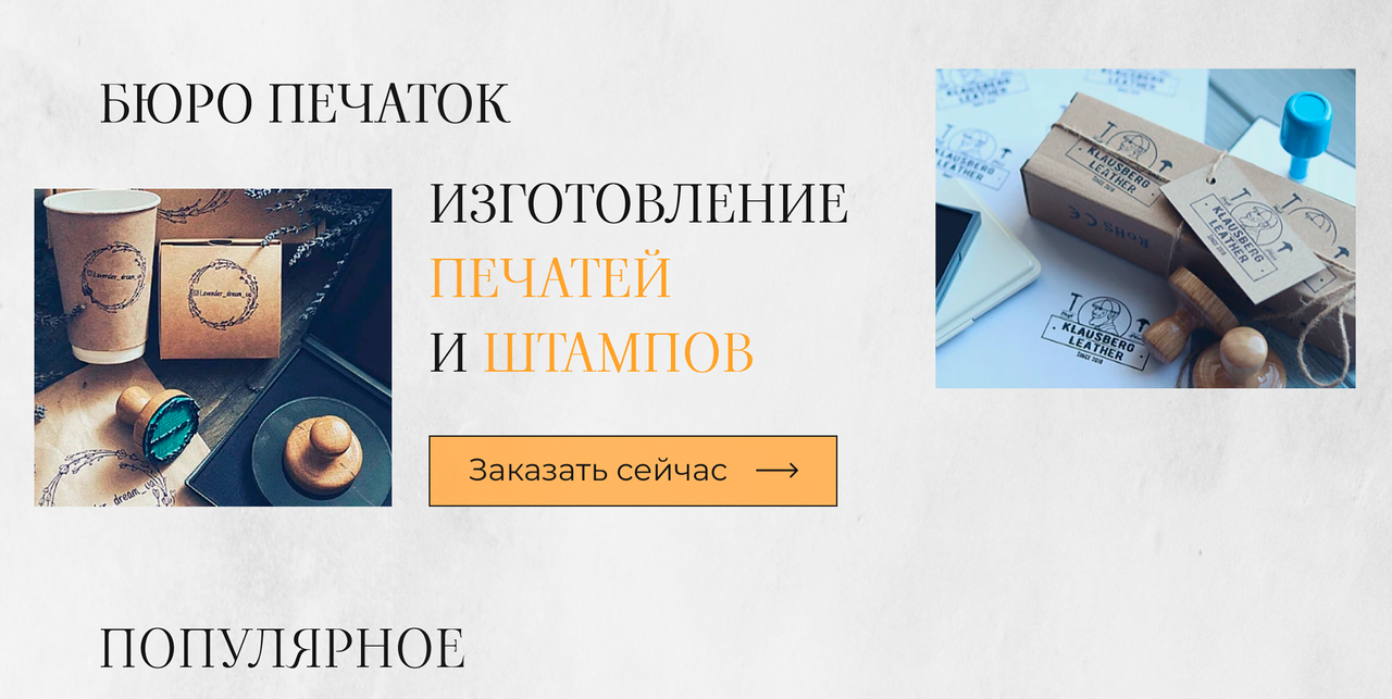 Наши работыШтампы для бумажных пакетов 120мм*120мм 1 090 ₴В наличииКупитьШтамп на деревянной оснастке 50мм 440 ₴В наличииКупитьШтампы для бумажных пакетов, размер 12*7см 910 ₴В наличииКупитьШтампы для крафт пакетов и картонных коробок, диаметр 14см 1 380 ₴В наличииКупитьПечати для врачей 17мм 440 ₴В наличииКупитьТрехцветная автоматическая печать для документов на оснастке пластиковая диаметр 40 мм 990 ₴В наличииКупитьШтамп круглый для брендирования бумажных стаканчиков, печатка для нанесения логотипа на упаковку товаров 310 ₴В наличииКупитьШтампы для крафт пакетов диаметр 5см 440 ₴В наличииКупитьШтампы индивидуальные, диаметр 40мм 300 ₴В наличииКупитьШтамп на деревянной оснастке 20мм 300 ₴В наличииКупитьРельєфная печать, диаметр 40мм 1 720 ₴В наличииКупитьАвтоматический штамп, двухцветный, размер 115*65мм 3 400 ₴В наличииКупитьШтампы для картонных коробок, 14*25см 2 070 ₴В наличииКупитьСургучная печать, пломбир под сургуч, диаметр 25мм 620 ₴В наличииКупитьСургучная печать, пломбир под сургуч, диаметр 30мм 650 ₴В наличииКупитьШтампы для крафт пакетов 60*25мм 320 ₴В наличииКупитьАвтоматическая оснастка для круглой печати 40мм 350 ₴В наличии R-542 КупитьШтампы для картонных коробок, деревянная ручка 8*8см 850 ₴В наличииКупитьШтампы индивидуального размера, з деревянной ручкой 10*6см 740 ₴В наличииКупитьШтампы для картонных коробок, 6*4.5см 350 ₴В наличииКупитьШтампы для бумажных пакетов, размер 10*14.5см 1 060 ₴В наличииКупитьШтамп для нанесения бренда на бумажные стаканы и пакеты 4*6 см, печать для брендирования упаковки товаров 450 ₴В наличииКупитьШтампы индивидуального размера, 6.5*5.5см 500 ₴В наличииКупитьШтамп для брендирования бумажных стаканов и пакетов 310 ₴В наличииКупитьВсе товары и услугиБюро Печаток - Изготовление печатей и штампов Группы товаров и услугПечати ШтампыШтемпельные аксессуарыДатеры и нумераторыФаксимиле (факсимильний штамп, факсимильная печать, штамп-подпись)